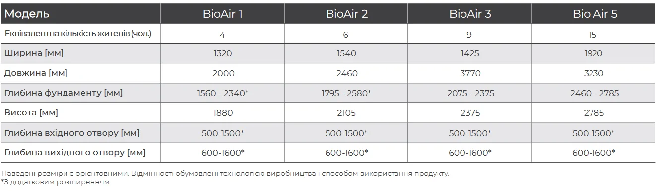Система BioAir® призначена для одно- та багатоквартирних будинків з максимальною кількістю мешканців до 15 осіб. Очисні споруди спроектовані таким чином, що сира вода в кінцевому результаті очищується до дуже високих стандартів якості. Показник зниження БСК5 досягає 97,5 відсотків. В якості опції може бути використана інтегрована каналізаційна насосна станція (КНС) з високоефективними поплавковими насосами.